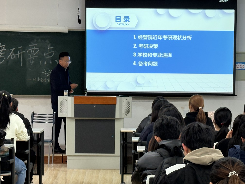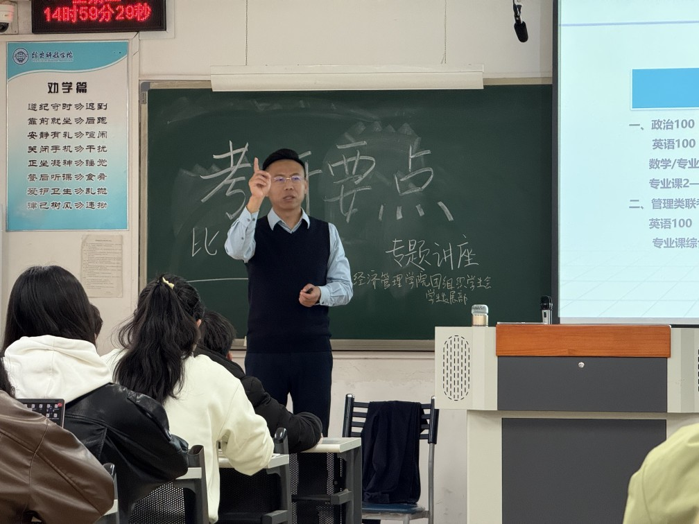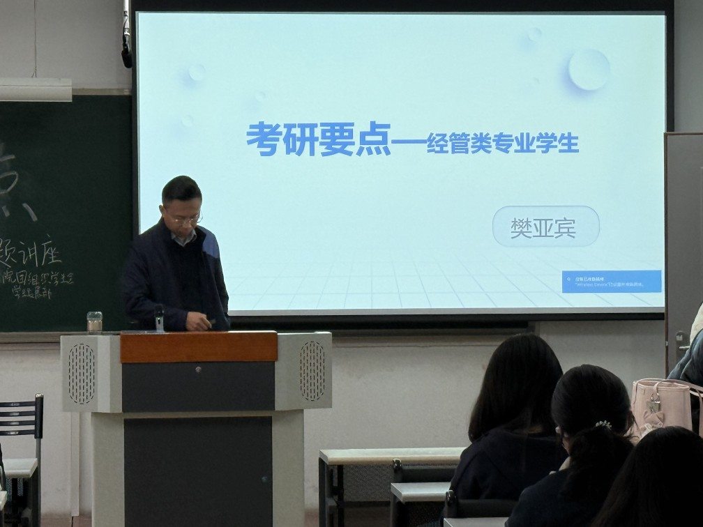 2025年10月22日,经管学业大讲堂聚焦“要不要考研、如何备考、如何选择学校和专业”主题,特邀防灾科技学院经验丰富的樊亚宾老师,开展“考研要点”专题讲座,让同学们在专业指导中厘清考研思路,为备考之路筑牢基础。