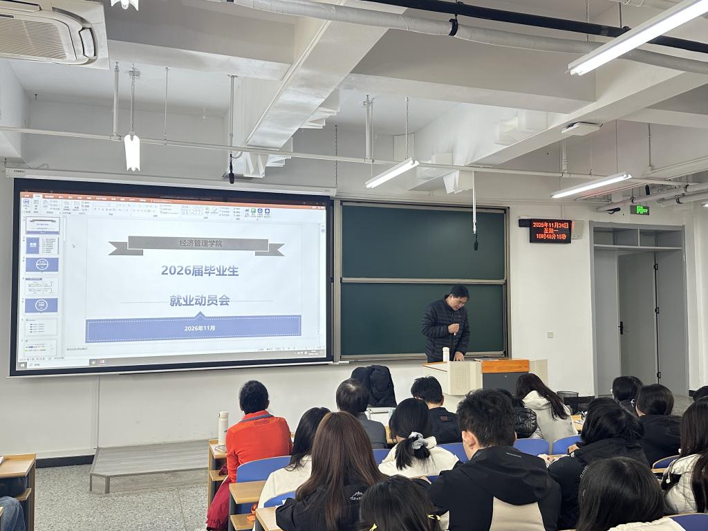 为扎实推进2026届毕业生就业工作,引导学生明确目标、积极行动,经济管理学院于近日在文德楼N106教室召开会计学、投资学专业毕业生就业工作促进会。经济管理学院联合党委书记谢长旺,会计学教研室主任黄敏、投资学教研室主任陈龙杰、各毕业班班主任、辅导员及2022级会计学、投资学专业全体在校学生参会。