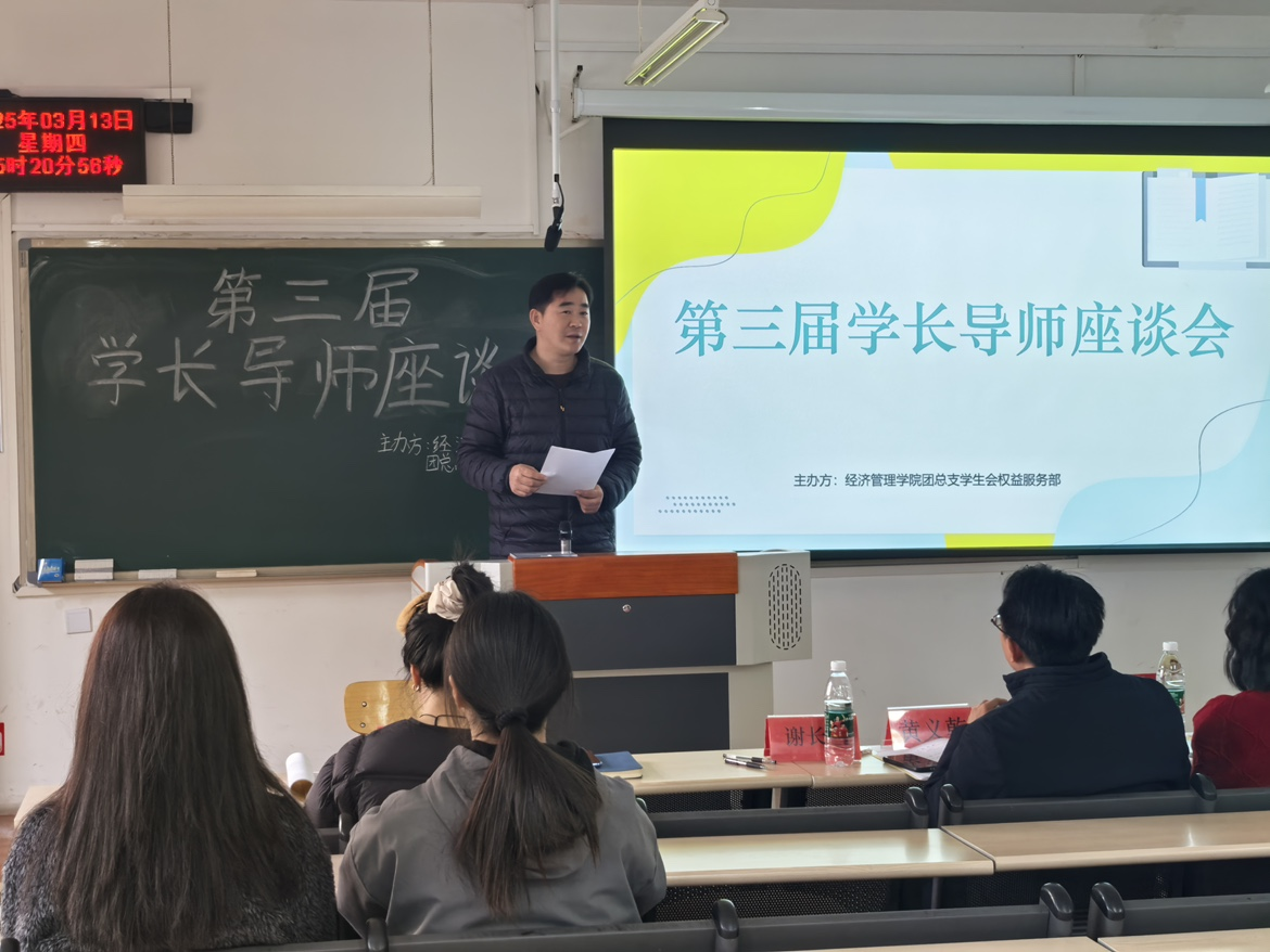 为了解我院学长导师工作开展情况、交流经验、总结不足,增进学长导师们对工作制度及内容的深入理解,进一步完善学长导师制度以更好地服务于同学们。经济管理学院于3月13日16点00在明略楼201教室举办“经济管理学院学长导师座谈会”。经济管理学院联合党委书记谢长旺、专职组织员黄义乾、辅导员闫粉粉、邓天宇与23级、22级总计50余位学长导师共同参会。