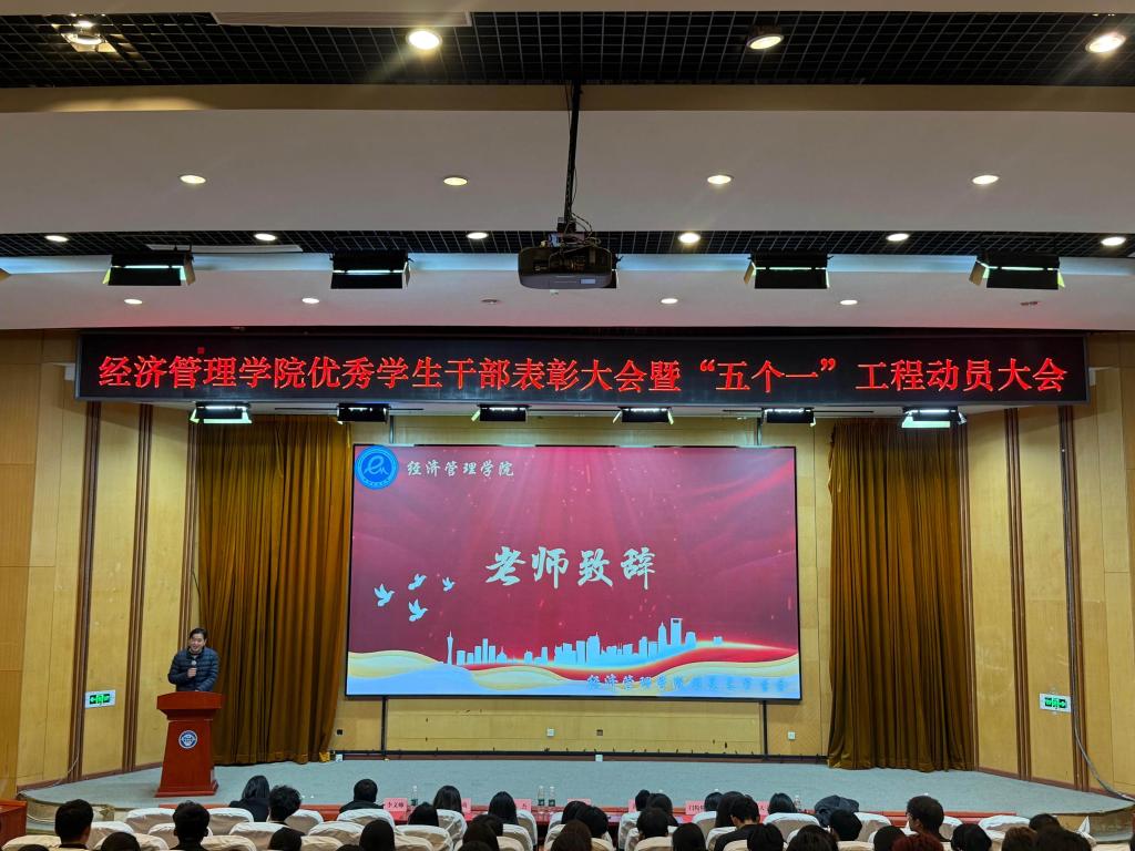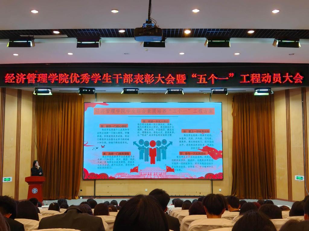 为了进一步推进校风、学风建设,鼓励学生不断提高综合素质和创新能力,围绕“立德树人”根本任务,培养在德智体美劳全面发展的社会主义建设者和接班人。10月29日下午,经济管理学院在图书馆报告厅隆重举行优秀学生干部表彰暨“五个一”工程动员大会。学院联合党委书记谢长旺、团总支书记陈杰、专职组织员黄义乾、辅导员孔雅萌、闫粉粉、邓天宇、李文帅老师及全体受表彰学生、2025级新生参加大会。