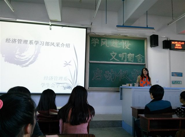2013年10月10日下午,学风建设以及文明宿舍评比活动启动仪式正式开始,出席此次活动的有经济管理系辅导员罗贵昕老师,系学生会学习部及生活部部长,2010级、2011级、2012级各班班长、团支书、学习委员、团支书,生活委员等。