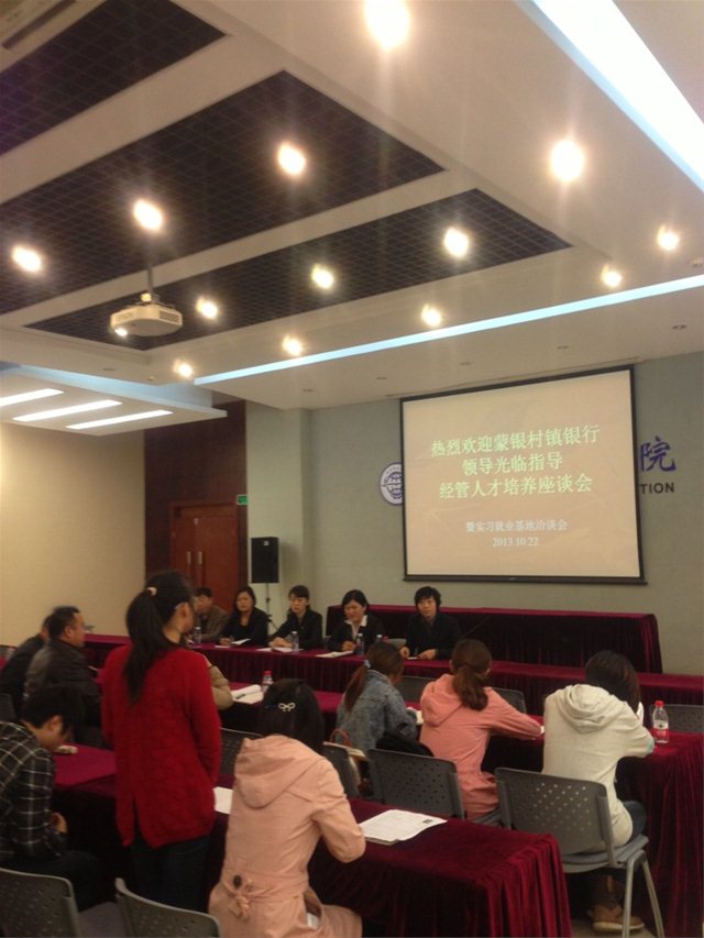 2013年10月22日上午9点,经济管理系邀请蒙银村镇银行相关领导,在学校多功能厅举办实习就业洽谈会,为即将毕业的金融、会计、工商管理等专业学生提供实习就业平台。招生就业处向勇处长、经济管理系党总支冯海成书记、罗贵昕老师、郑建锋老师,及40余名毕业学生参加了此次洽谈会,进一步了解用人单位需求及对我系人才培养的建议。